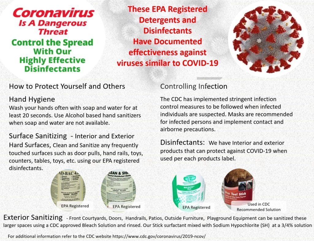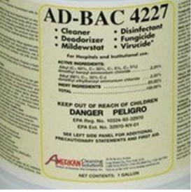 Ad Bac is an EPA Registered cleaner and disinfectant designed for institutional and commercial use. Where contact surface cleanliness is of prime importance in controlling the hazard of cross-contamination. Specifically designed for use in: Offices, Hospitals, Nursing Homes, Schools and Food Service, Ad Bac’s highly concentrated, lemon scented, dual Quaternary formula kills Human Coronavirus, HIV-1, Herpes Simplex, Salmonella, Pseudomonas, Strep, MRSA and more.
