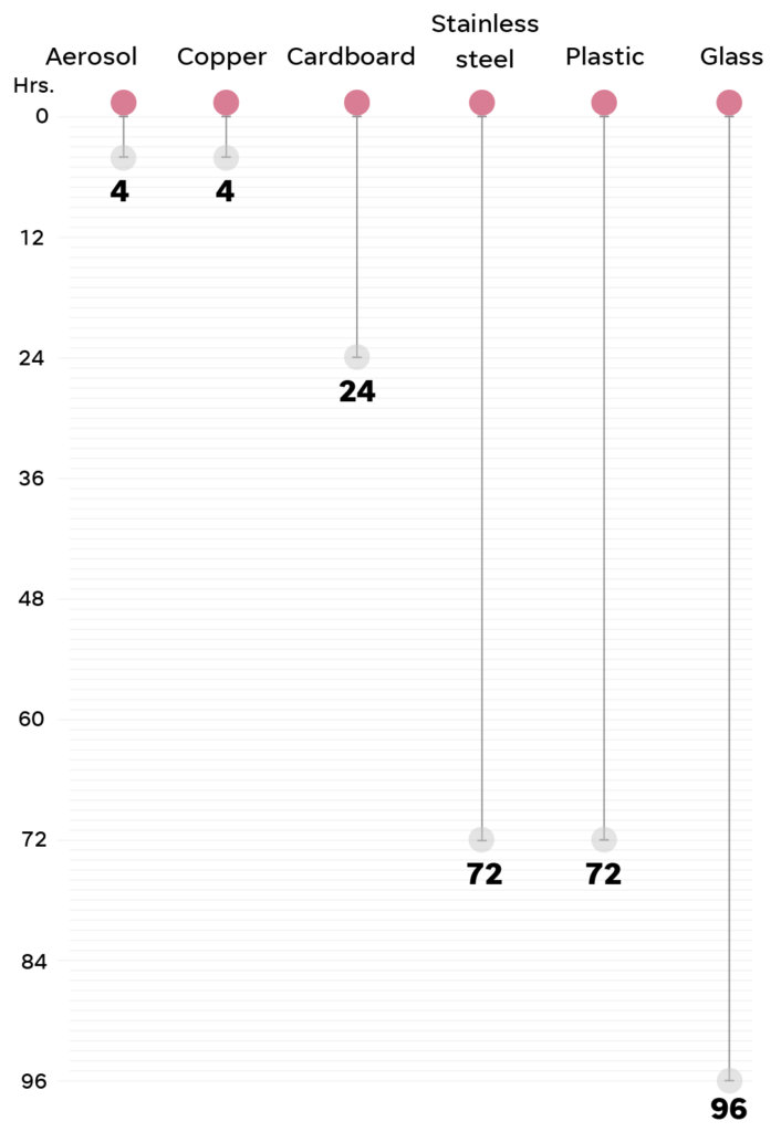 Depending on the surface, it can be just a few hours, or up to 4 days. COVID in the air,and on cardboard, last about 4 hours. If it gets spread to glass, it stays on the surface for 4 days. Here’s more: