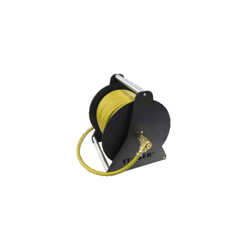 Comes complete with 150' of 3/8" premium hose line. -Made of powder coated steel and aluminum. Brass manifold and swivel inlet. -Designed to be carried around on the jobsite or mounted permanently in location -Holes in the base of the reel allow for mounting to the surface of your choice.